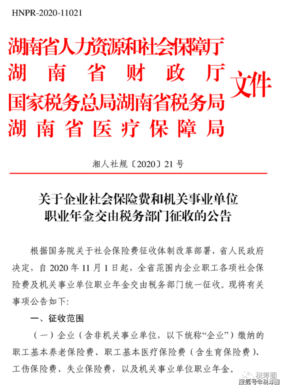 根据国务院关于社会保险费征收体制改革部署,省人民政府决定,自2020年11月1日起,全省范围内企业职工各项社会保险费及机关事业单位职业年金交由税务部门统一征收。现将有关事项公告如下: