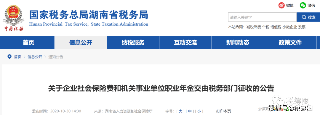10月30日,上海、北京,深圳、青岛、天津、山西、山东、吉林、江西、湖南、广西、贵州、四川、新疆、西藏等118个省(区、市)和3个计划单列市发布关于企业社会保险费交由税务部门征收的公告。按照社会保险费征收体制改革部署,自2020年11月起,企业职工各项社会保险费交由税务部门统一征收。